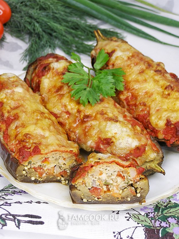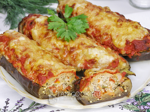 Из фарша формируем котлетки и кладём их внутрь половинок баклажанов.