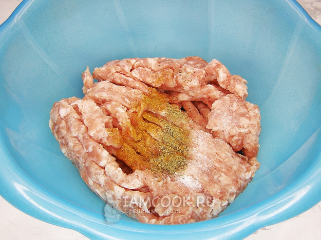 Теперь приготовим начинку. В фарш добавляем соль (примерно 0,5 ч.л.), чёрный молотый перец и молотую паприку по вкусу.