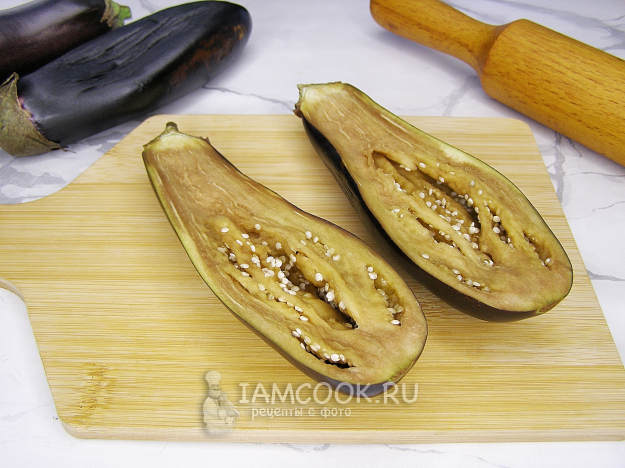 Каждый баклажанчик сначала отбиваем скалкой, потом прокатываем скалкой вдоль и поперёк, пока овощ не станет мягким. Разрезаем отбитый баклажан вдоль пополам. Если вы не любите зёрнышки, то их можно счистить ложкой и сполоснуть баклажан водой.