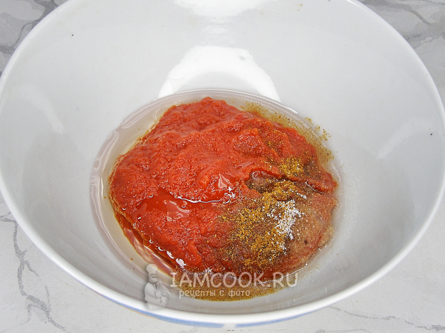 Для приготовления соуса смешиваем томатную пасту, растительное масло, немного солим, добавляем чёрный молотый перец и паприку по вкусу.