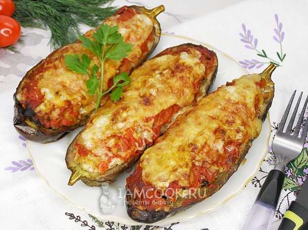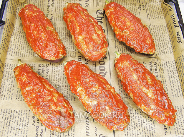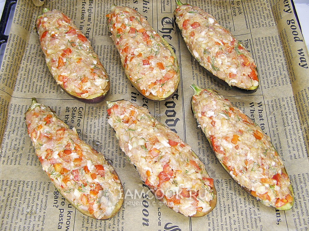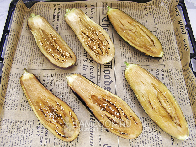 Перекладываем подготовленные баклажаны на противень, застеленный бумагой для выпечки, или в форму для запекания.