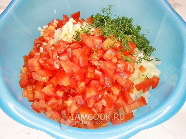 Так же, небольшими кубиками, нарезаем помидоры. Перекладываем их в фарш, добавляем измельчённую зелень и чеснок, пропущенный через пресс. Всё вместе хорошо перемешиваем.