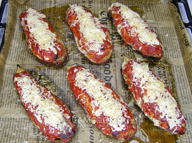 Ставим противень в прогретую до 180 градусов духовку и запекаем 40-50 минут. Примерно за 10-15 минут до готовности посыпаем баклажаны натёртым сыром и отправляем обратно в духовку.