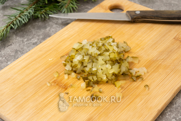 Далее нарезаю соленые огурцы. Именно соленые, а не маринованные.