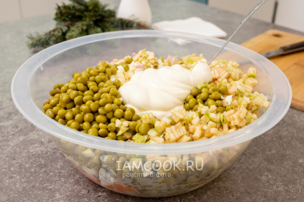 Осталось положить горошек (уже без жидкости, масса нетто - 266 г), майонез и перемешать салат. Получился внушительный тазик Оливье. После того как все перемешано, я обязательно пробую салат и при необходимости могу каких-нибудь компонентов добавить. Тут уж я ориентируюсь на свой вкус (а мой вкус в количественном значении можно посмотреть в ингредиентах).