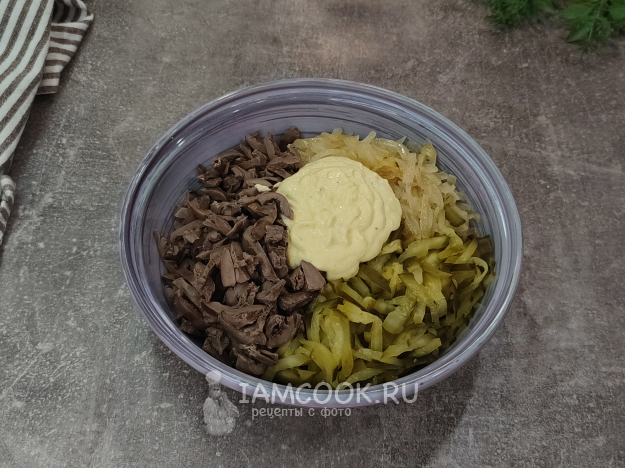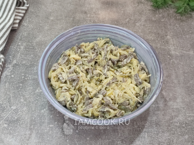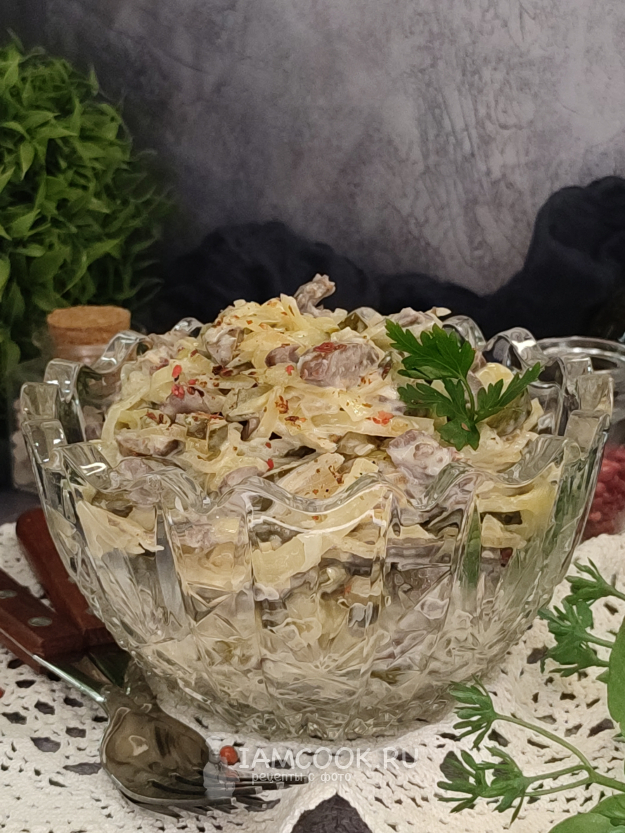 Салат с куриными сердечками и маринованными огурцами, рецепт с фото