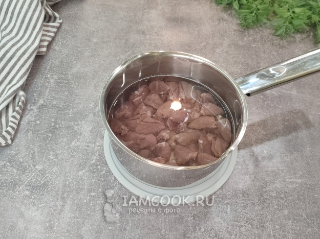 Сердечки промойте, удалите лишний жир, кровеносные сосуды, кровяные сгустки, залейте сердечки холодной водой, варите до готовности 20-30 минут.