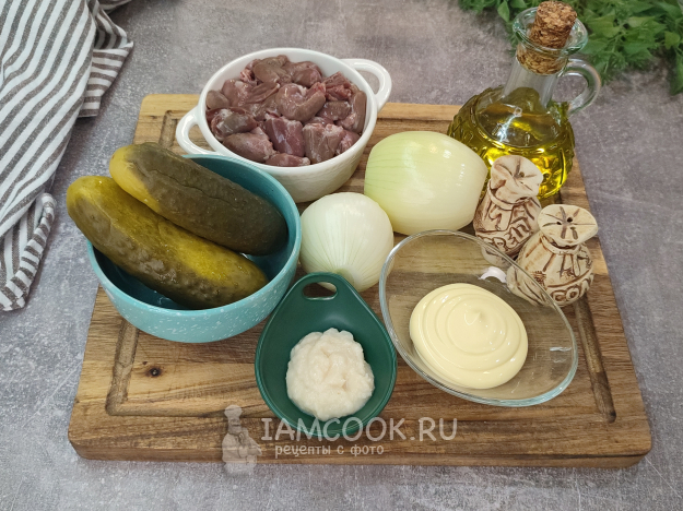 Соберите ингредиенты для приготовления салата с куриными сердечками и маринованными огурцами. Основных продуктов берем примерно в равном количестве.