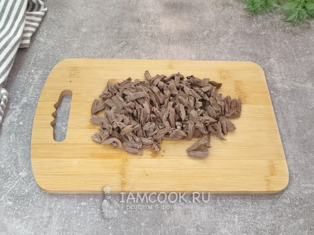 Отваренные и остывшие до комнатной температуры сердечки нарежьте на 2-4 части.