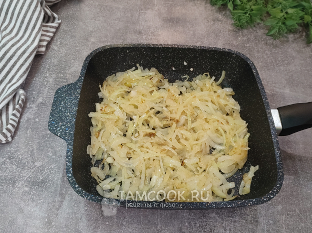 В сковороде разогрейте масло, обжарьте лук до прозрачности и легкой золотистой корочки. Сильно не зажаривайте, чтобы он не горчил в салате.