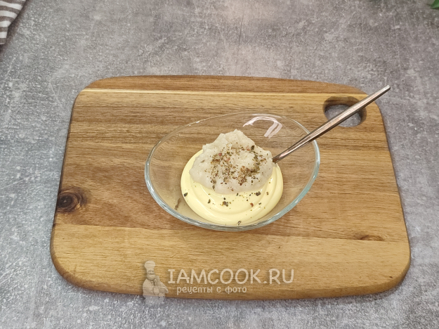 Для заправки соедините майонез, хрен, перец. Хрен выбирайте качественный и вкусный)).