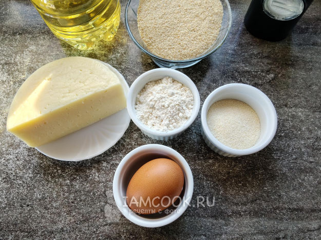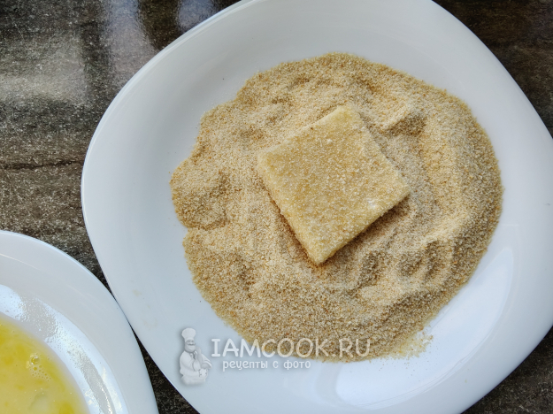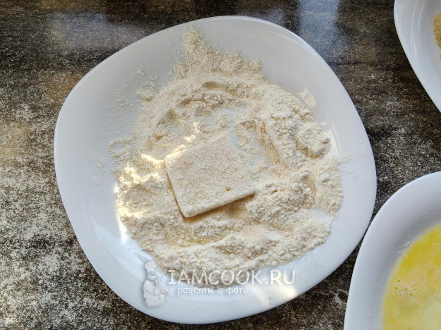 Сыр обмакнуть в воду, а затем обвалять в муке с манкой.
