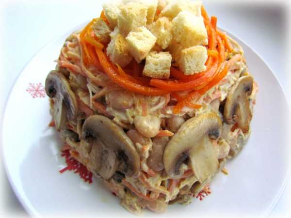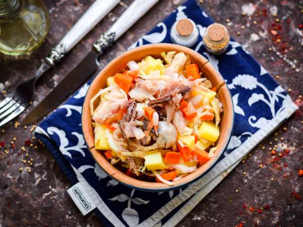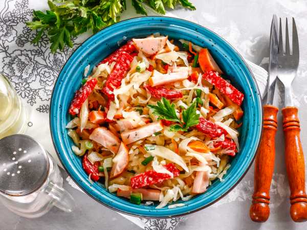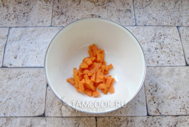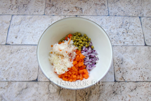 Квашеную капусту отожмите от рассола и добавьте в винегрет. Отварную морковь нарежьте кубиками, как батат.