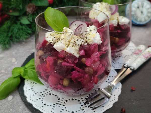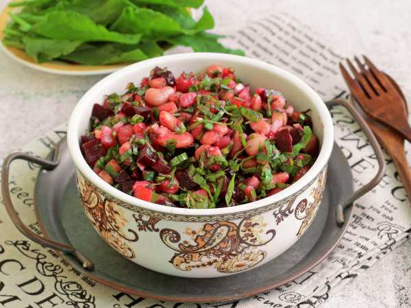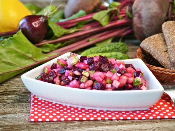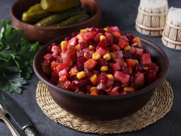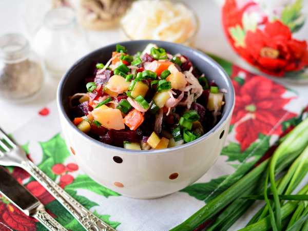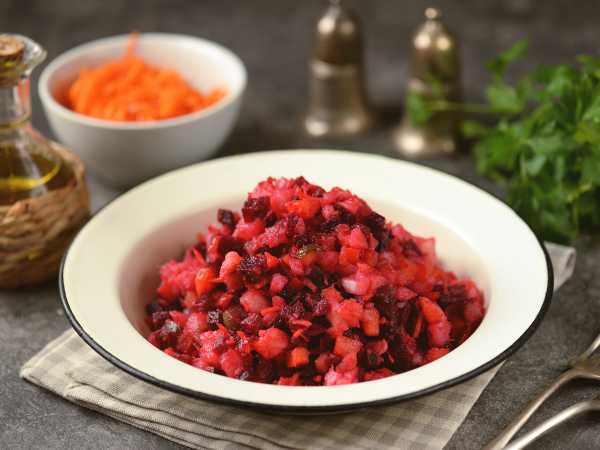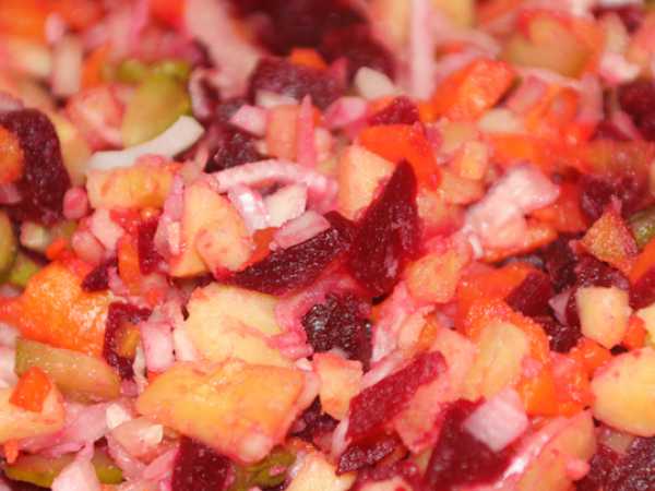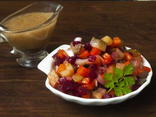 Предварительно отварите до готовности в кожуре батат, морковь и свеклу, которую варите в отдельной кастрюле. Овощи охладите, очистите. Батат нарежьте кубиками и выложите в миску.