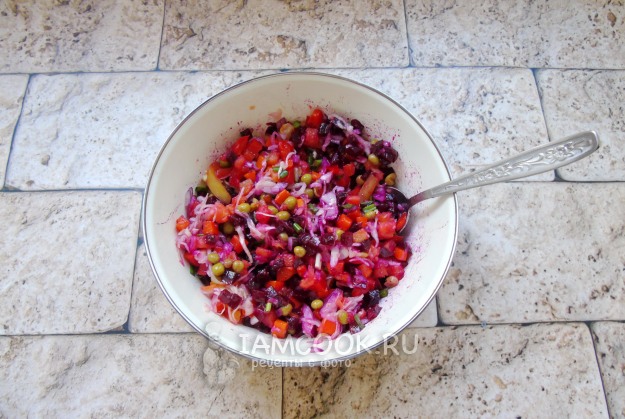 Винегрет посолите и заправьте ароматным подсолнечным маслом.