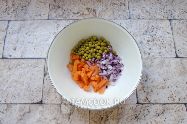 Красный лук нарежьте мелко. Из банки с консервированным горошком слейте рассол. Горошек выложите в миску.