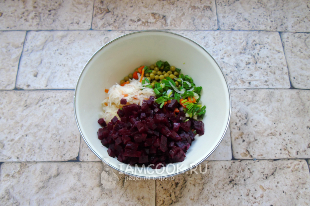 Отварную свеклу нарежьте кубиками, а зеленый лук - мелко.
