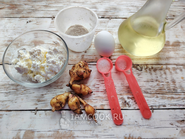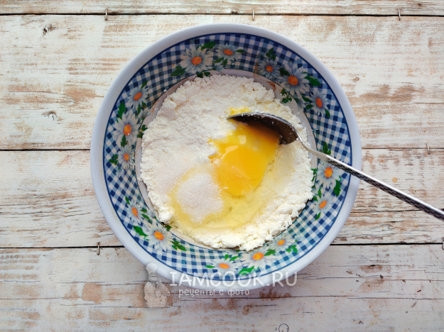 В миску с творогом вбить яйцо, добавить сахар, соль.