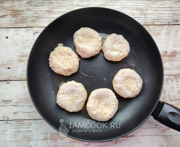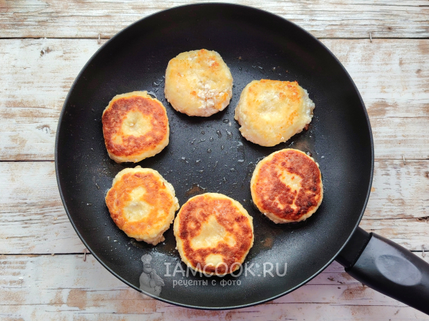 На разогретом масле обжарить сырники до румяности с одной стороны.