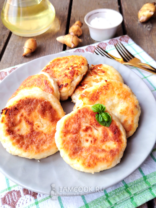 К столу сырники с топинамбуром подать со сметаной, сгущенным молоком или иной добавкой. Приятного аппетита!