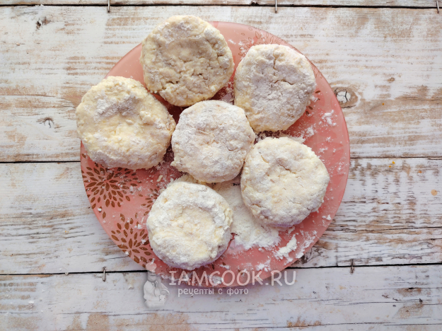 Сформировать чистыми влажными руками шайбочки из массы. Обвалять их в муке, насыпанной в блюдце.
