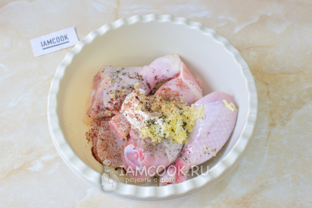 В чашу выложите куриные голени. Добавьте к ним сметану и растительное масло. Пропустите через пресс чеснок. Подсыпьте соль и специи.