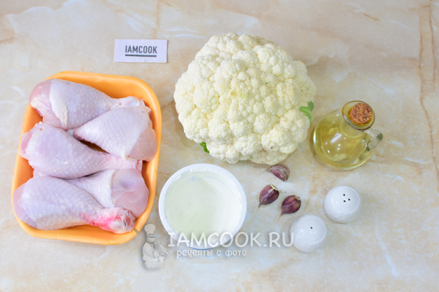 Чтобы приготовить куриные голени с цветной капустой в духовке, соберите необходимые ингредиенты по списку.