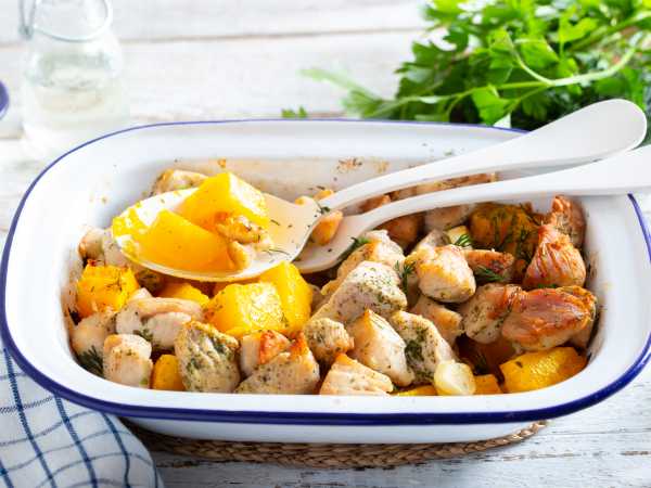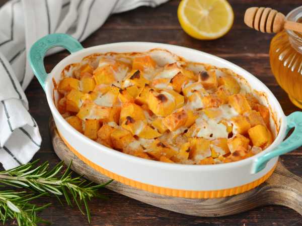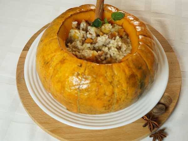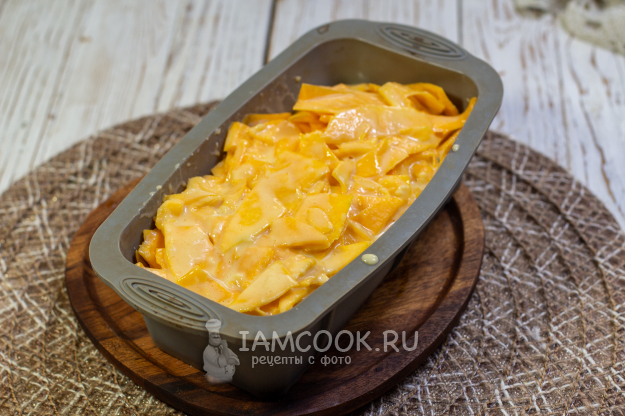 Переложите тыкву с тестом в форму для запекания и отправьте в разогретую до 180 градусов духовку на 35-40 минут.