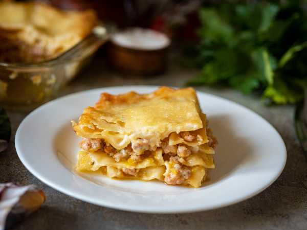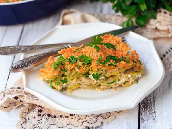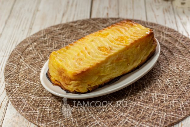 Достаньте готовую запеканку, дайте ей немного остыть в форме, а затем аккуратно переложите на блюдо.