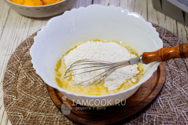 Всыпьте муку и разрыхлитель. Тщательно перемешайте тесто, до однородного состояния, чтобы не было комочков. Тесто получается достаточно жидким, почти таким же, как на тонкие блины.