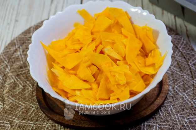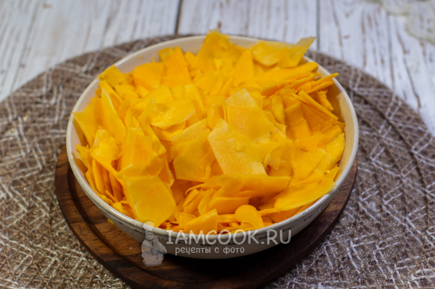 Овощечисткой, острым ножом или специальной теркой нарежьте ее как можно тоньше на ломтики.