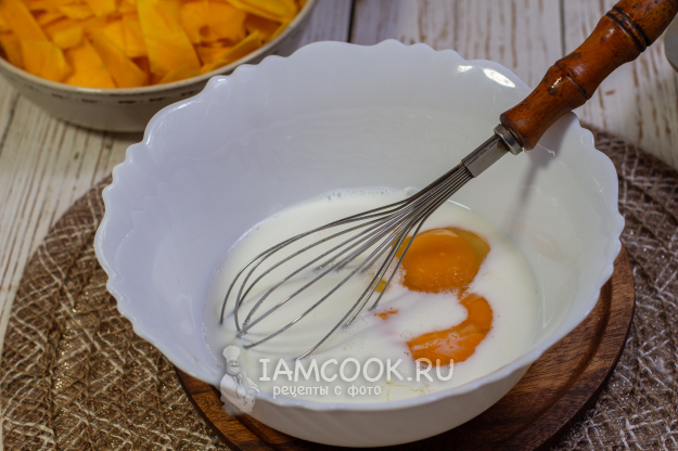 В отдельной глубокой миске соедините куриные яйца, соль, сахар и молоко. Можно добавить любимые специи, я добавила немного ванилина. А также очень хорошо сочетается с таким пирогом апельсиновая или лимонная цедра.
