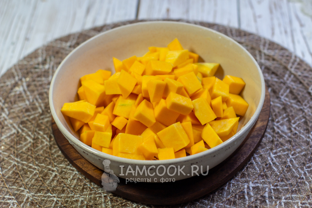Достаньте полуготовую тыкву из духовки. Я запекала ее 15 минут, вы ориентируйтесь на сорт вашей тыквы и особенности вашей духовки. Тыква должна стать лишь слегка мягкой.