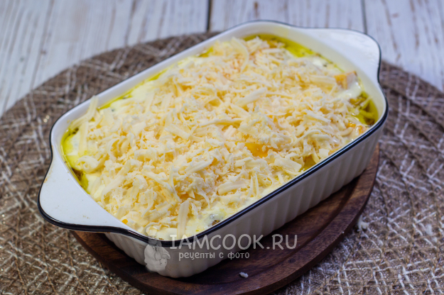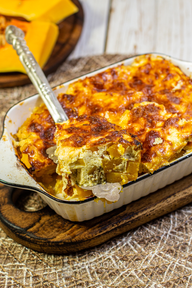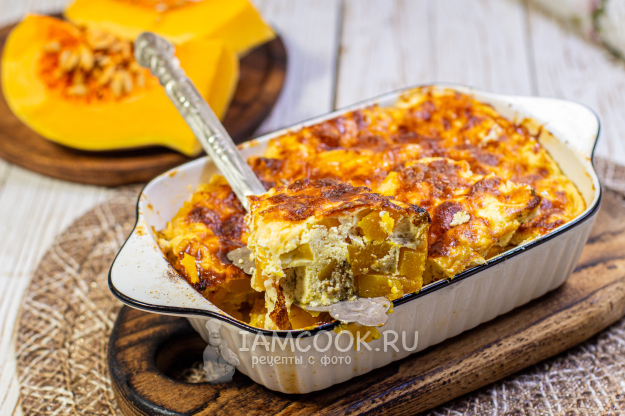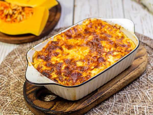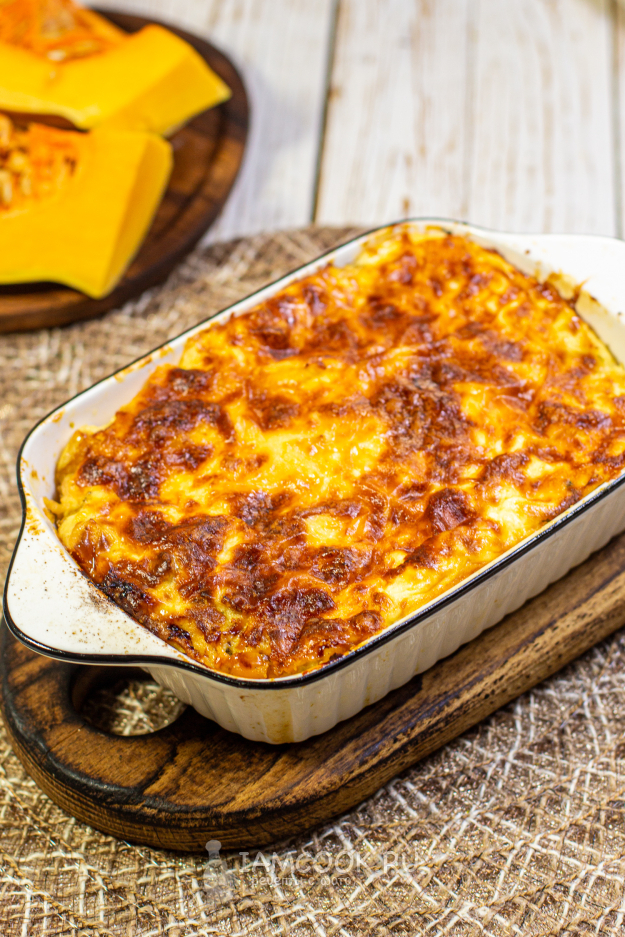 Сверху посыпьте натертым сыром Моцарелла и готовьте запеканку из тыквы с сыром в духовке еще 20 минут при 180 градусах.