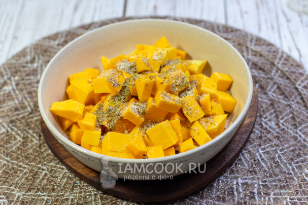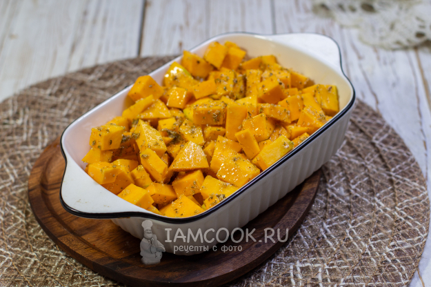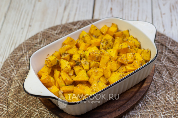 Переложите подготовленную тыкву в форму для запекания и отправьте в разогретую до 180 градусов духовку на 10-15 минут.