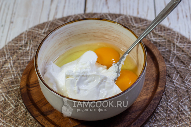 Пока тыква запекается, приготовьте заливку: смешайте куриные яйца, сыр Рикотта, греческий йогурт, соль и черный молотый перец.