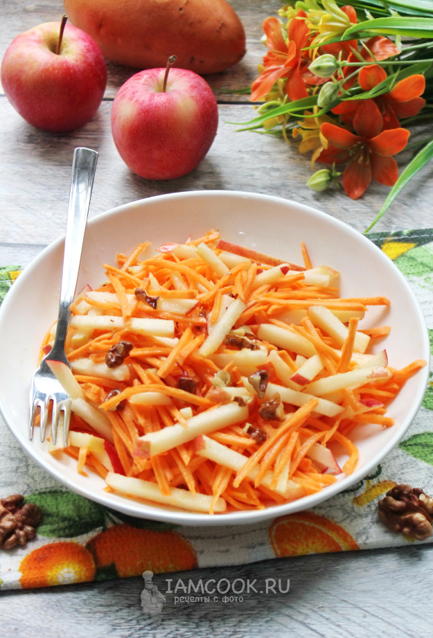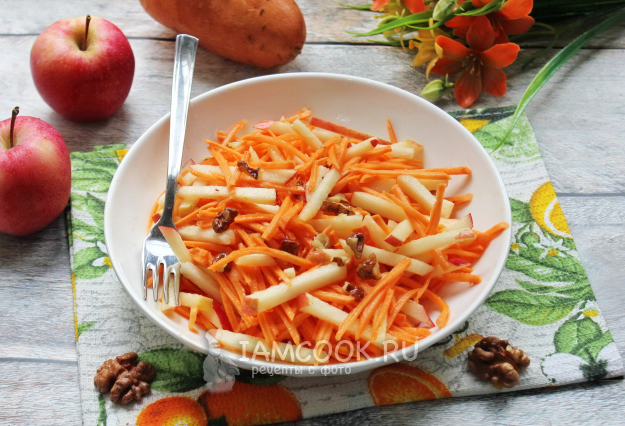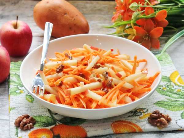Батат в сыром виде отлично подходит для приготовления салатов. Предлагаю вам рецепт одного из них с яблоками и грецкими орехами. Сырой батат по вкусу очень похож на морковь. Яркое, сочное, вкусное, насыщенное витаминами блюдо. Яблоки берите кисло-сладкие, лимон можно заменить лаймом, а грецкие орехи - пеканом, фундуком или миндалем.