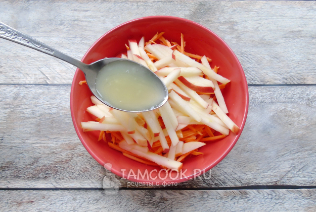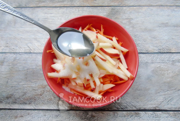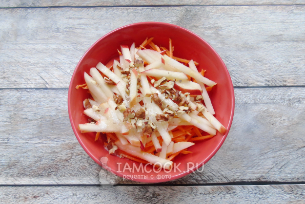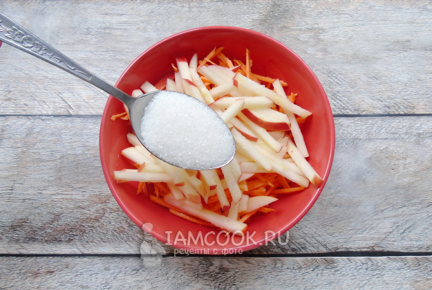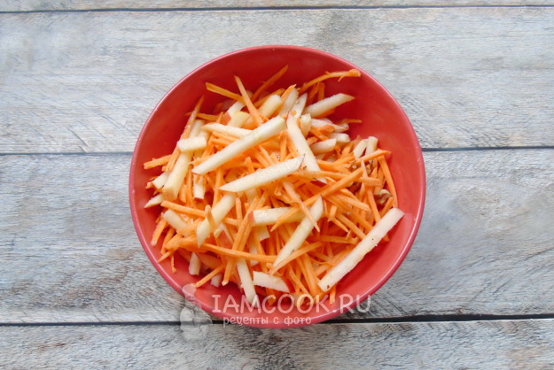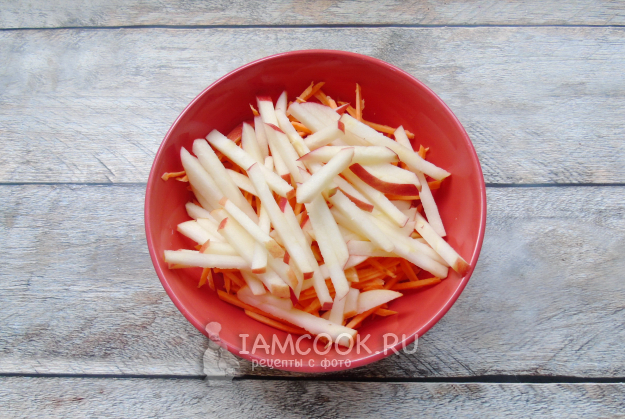 Яблоки помойте, удалите сердцевину и тоже нарежьте соломкой. Чистить их не обязательно.