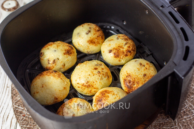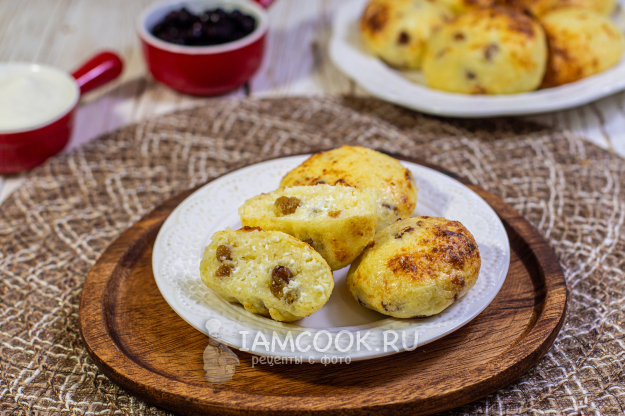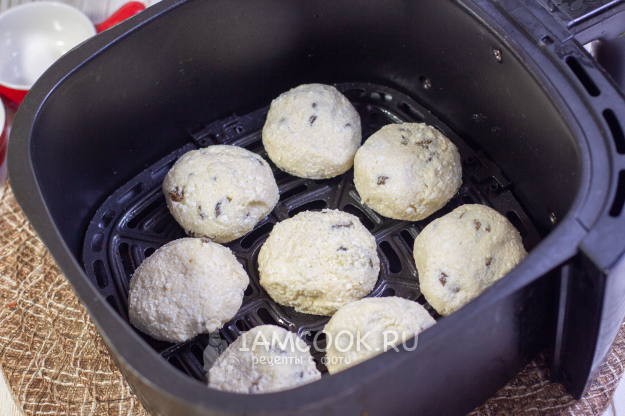 Слегка влажными руками сформируйте сырники и выложите на решетку аэрогриля. Выпекайте пышные сырники с изюмом в аэрогриле 15 минут при температуре 170 градусов.