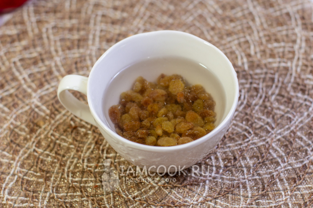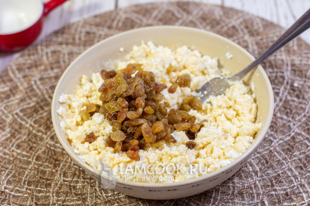 Чтобы приготовить сырники с изюмом, нужно перебрать изюм: отделить, если есть, мусор и оторвать "хвостики". Промыть и немного распарить, залив его небольшим количеством кипятка (примерно на палец выше уровня изюма). Накройте тарелкой и отставьте в сторону. Я оставила изюм на 5 минут в кипятке, а затем промыла под водой и обсушила бумажными полотенцами.
