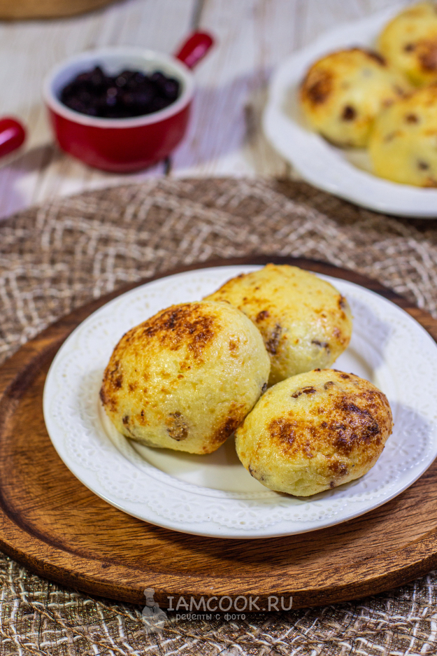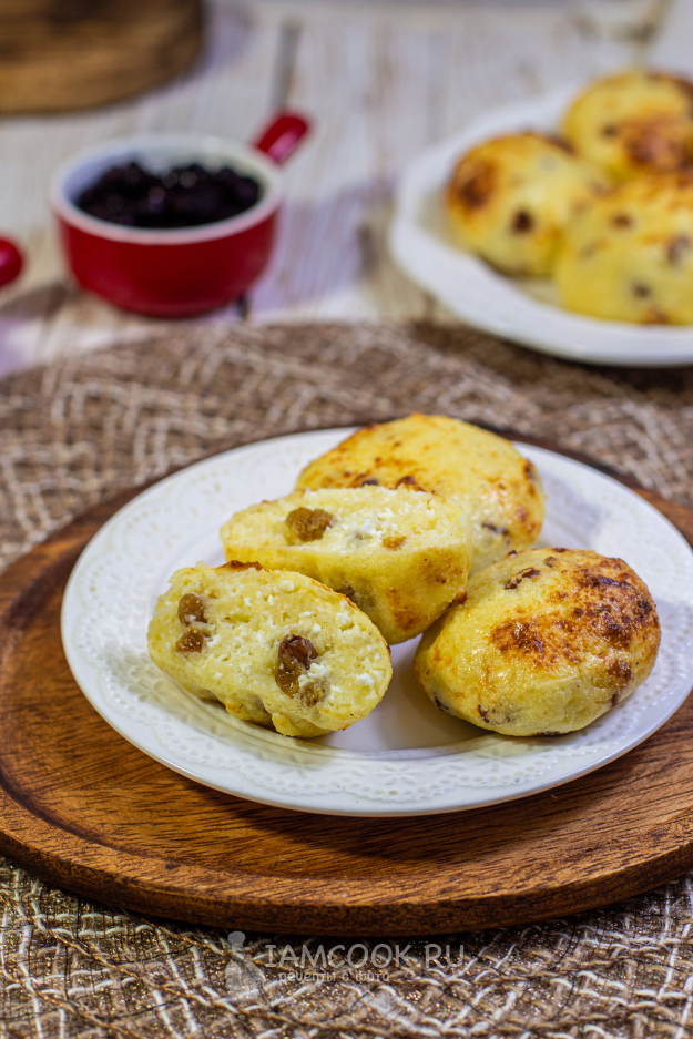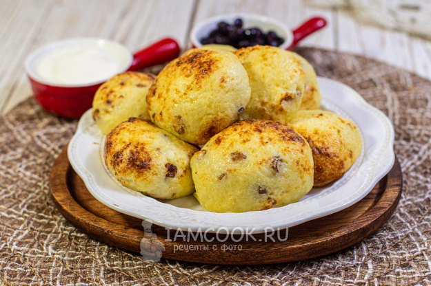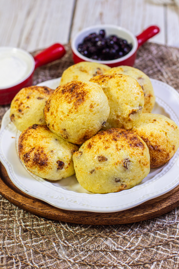 Пышные, румяные и очень вкусные сырники с изюмом готовы! Подавайте их со сметаной и свежими ягодами. Приятного аппетита!