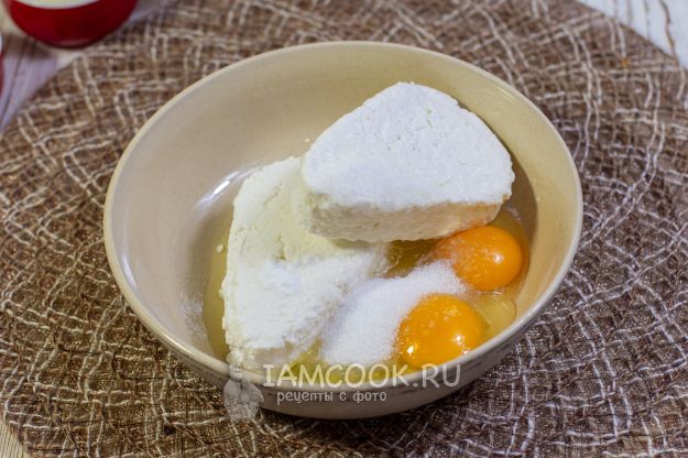 В подходящую посуду выложите творог, добавьте куриные яйца, соль, ванилин и сахар. Кстати, количество сахара используйте на ваш вкус или замените на любой подсластитель. Тщательно разомните творог с яйцами.