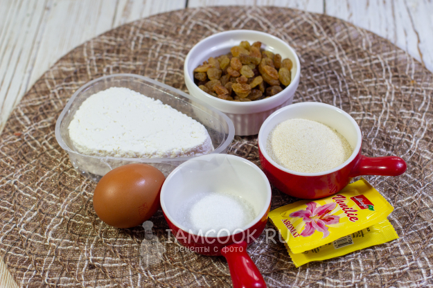 Соберите необходимые продукты для приготовления сырников с изюмом в аэрогриле. Успех вкусных сырников - это правильный выбор творога. Творог должен быть качественным, вкусным и сухим, без лишней сыворотки. Также не подходит для сырников зерненый творог. Я покупаю творог в брикетах, жирностью 5-9%. Изюм можно взять как светлый, так и темный.