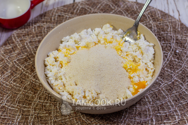 Добавьте в творожную массу манную крупу. Перемешайте.