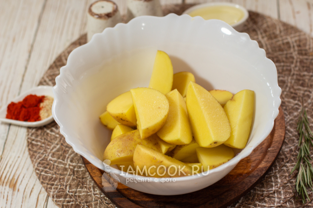 Нарежьте клубни картофеля на крупные дольки и сложите их в глубокую миску.