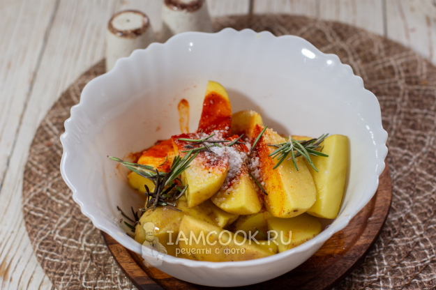 Добавьте соль, черный молотый перец, молотую паприку, сушеный чеснок и иголочки свежего розмарина. Налейте растительное масло. Тщательно перемешайте.