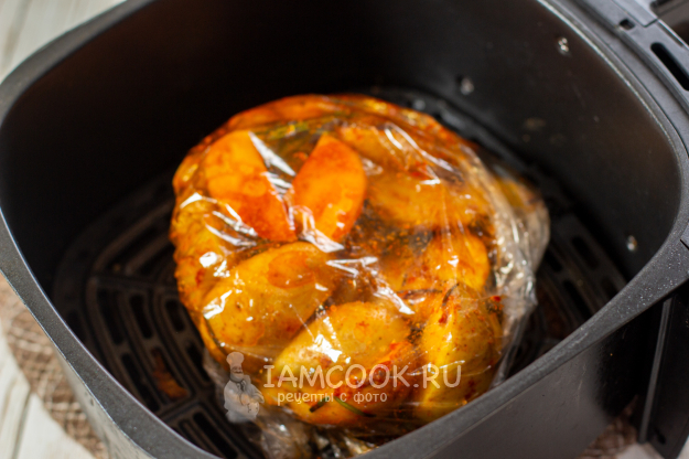 Положите картофель в рукав для запекания и зафиксируйте один конец. Завяжите второй конец рукава и хорошо потрясите, чтобы все ингредиенты перемешались. Переложите в чашу аэрогриля на решетку узелками вниз, сделайте несколько проколов на рукаве зубочисткой.