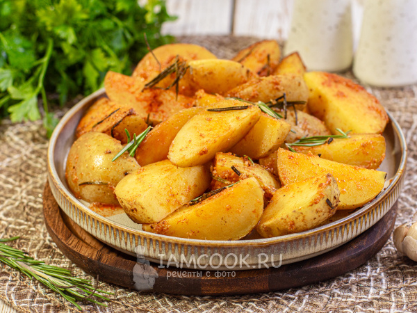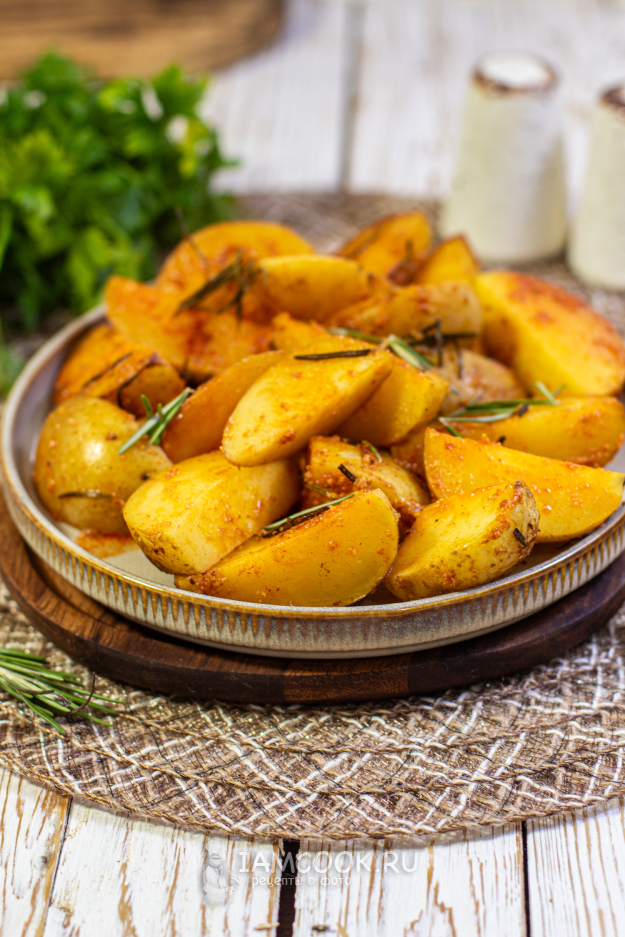 Соберите необходимые продукты для приготовления картофеля в рукаве в аэрогриле. Я взяла белый картофель с тонкой кожурой. Из специй я взяла сушеный чеснок, молотую паприку и свежий розмарин. Вы можете добавить те, которые нравятся вам.
