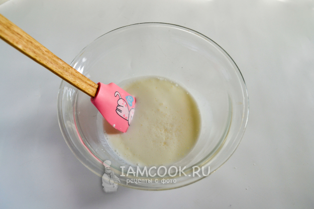 Кефир влейте в миску, добавьте соду, перемешайте, оставьте на несколько минут, чтобы началась реакция. Кефир станет воздушным, объемным. Добавьте соль и перемешайте.