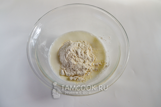 Понемногу всыпайте муку и сразу перемешайте тесто. Сначала ложкой, затем руками.